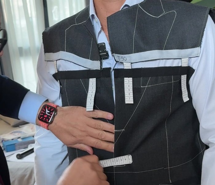 Sí, una prueba con la prenda hilvanada en tu domicilio para afinar caída, entalle y proporciones.